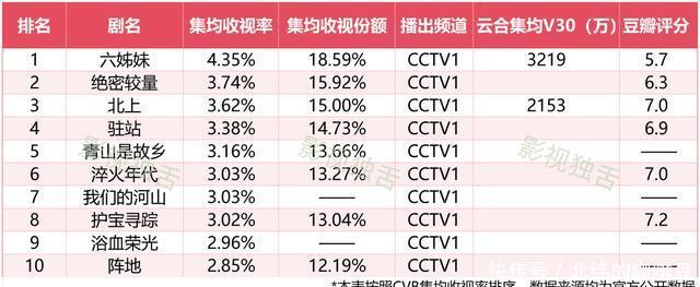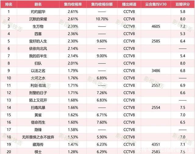 一部,所以集均收视率2.61%位居榜单比肩第一的《千里默的荣耀》。它亦然本榜单上豆瓣评分最高的剧集。 算作国内首部聚焦新中国建树前后台湾暗藏阵线战役的作品,它的社会价值无需多言。但它的热播,并非“题材决定论”的效果。