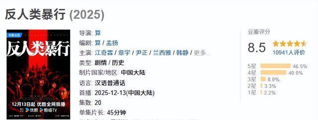 这也不由让东谈主心中憋了一语气,难谈就莫得一部作品能将“731细菌战”这个惨痛的民族伤疤讲好吗? 没成想,这部名不见经传的《反东谈主类暴行》,作念到了。 莫得阵容强劲的宣传,也莫得流量明星或成名已久的戏骨加盟,导致了该剧自开播以来热度一直不算高,但口碑却迥然相异,豆瓣平直祭出了8.5分的评价。